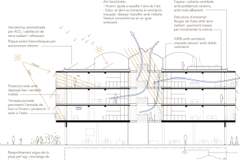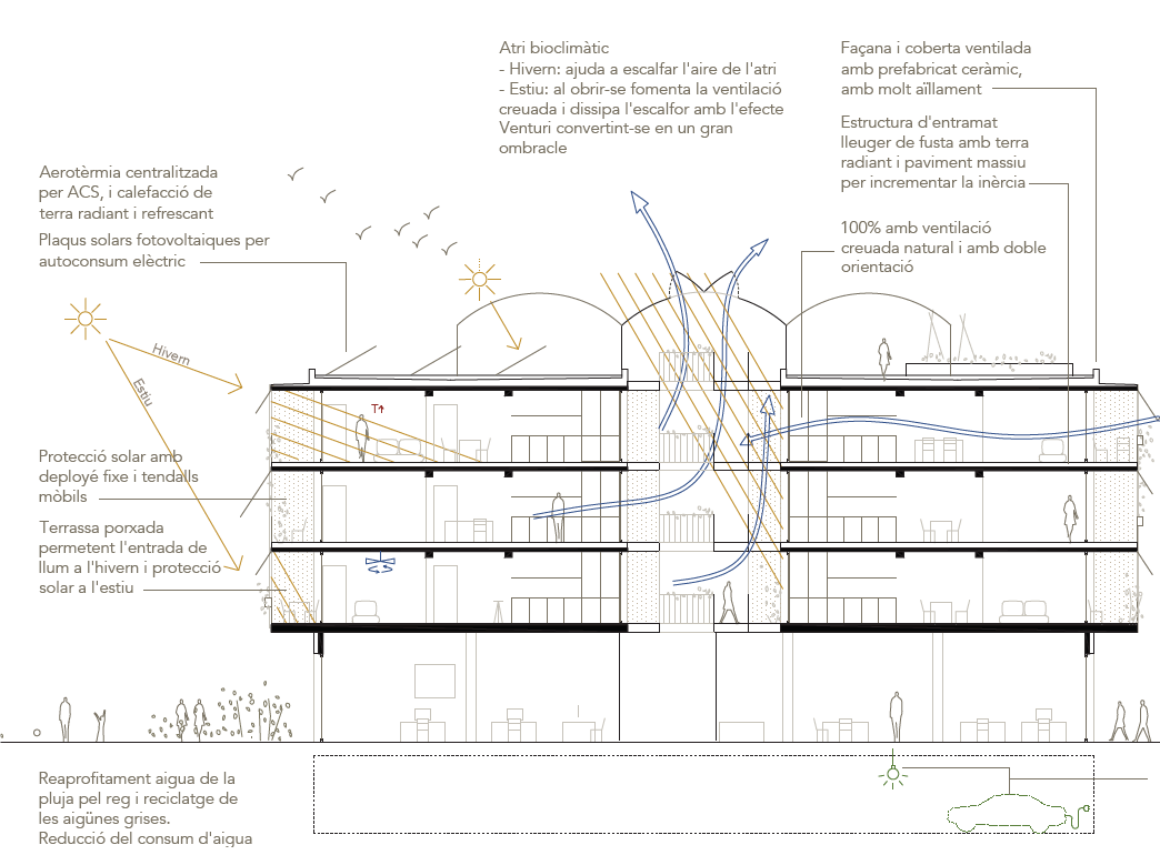 L’edifici a més de disposar de sistemes passius de control tèrmic com l’hivernacle del pati central, la envolupant aïllada i amb protecció solar o la ventilació creuada en els habitatges, també estarà equipat amb sistemes de producció d’energia renovable com plaques fotovoltaiques per produir electricitat i equips d’aerotermia per produir aigua calenta i calefacció. Amb aquests elements la demanda energètica de l’edifici serà molt baixa i això es traduirà en rebuts energètics baixos.
