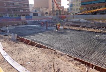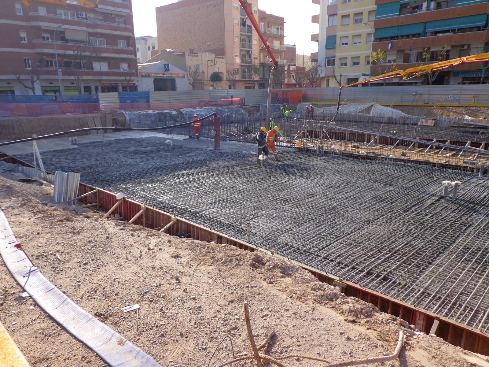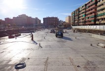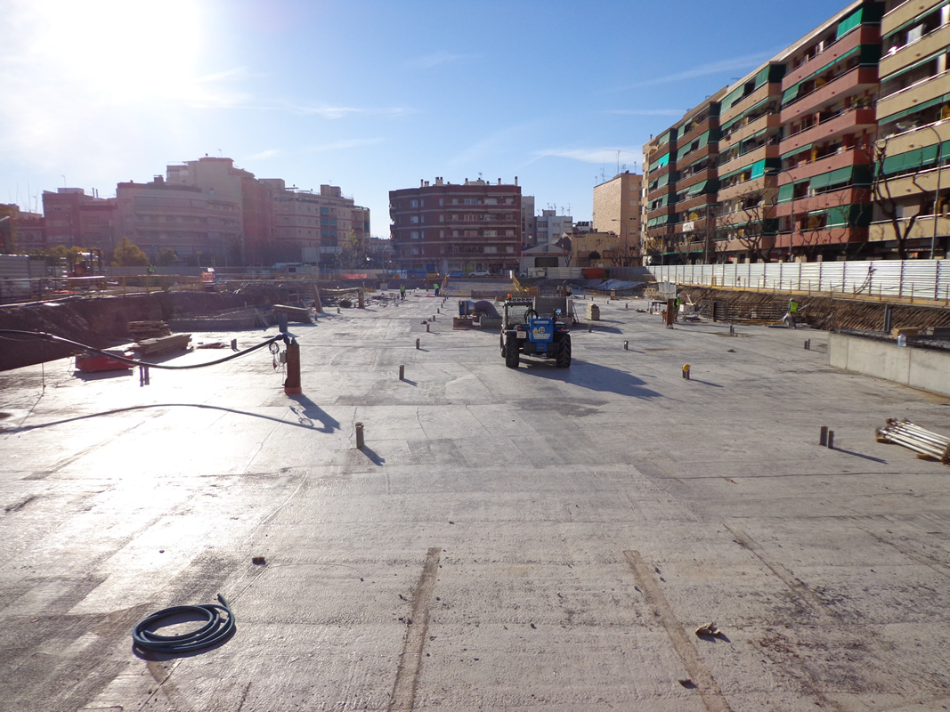 Construcción de forjado de cubierta mediante losa “in situ” de hormigón armado de 60 cm de grueso encofrada sobre el propio terreno, apoyada sobre los pilares interiores metálicos encastados en las pantallas interiores.